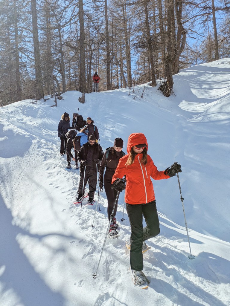 Les conversations vont bon train pendant les randonnées en raquettes ou à pied. On marche quelques minutes avec un collègue en discutant, puis on s’assoit à côté d’une autre au pique-nique. On apprend à se connaître, en mouvement.