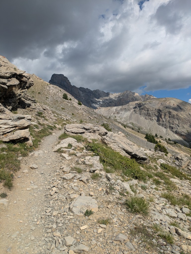 Départ de Saint Paul sur Ubaye. L’Éco Pain est ouvert, chic ! Pain au levain et recommandations de sommets du boulanger en poche, cap sur Fouillouse, puis le lac de Chambeyron. 1300 mètres de dénivelé en plein soleil. Meli melo de pensées dans la tête : visiblement les premières heures de marche solitaire sont consacrées à la vidange mentale. Bivouac parfait au bord du lac avec les nuages en toile de fond, enveloppée par le silence.